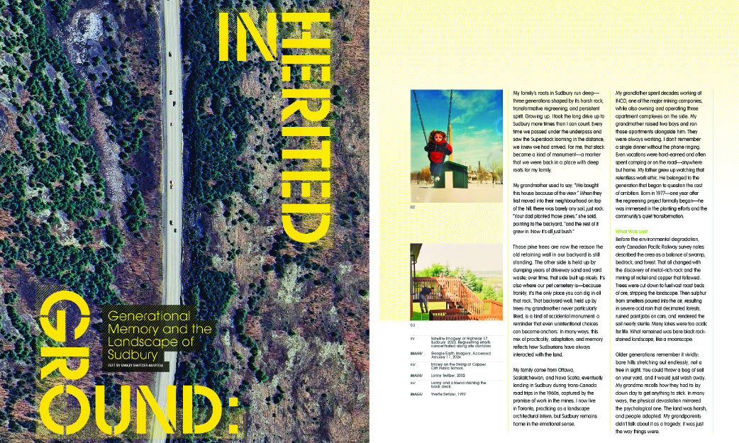 In “Inherited Ground: Generational Memory and the Landscape of Sudbury,” featured in Issue 70 of Ground: Landscape Architect Quarterly, JRS Junior Designer Emiley Switzer-Martell examines processes of repair, attentiveness to land, and placekeeping in the aftermath of environmental degradation in her home city of Sudbury, Ontario.