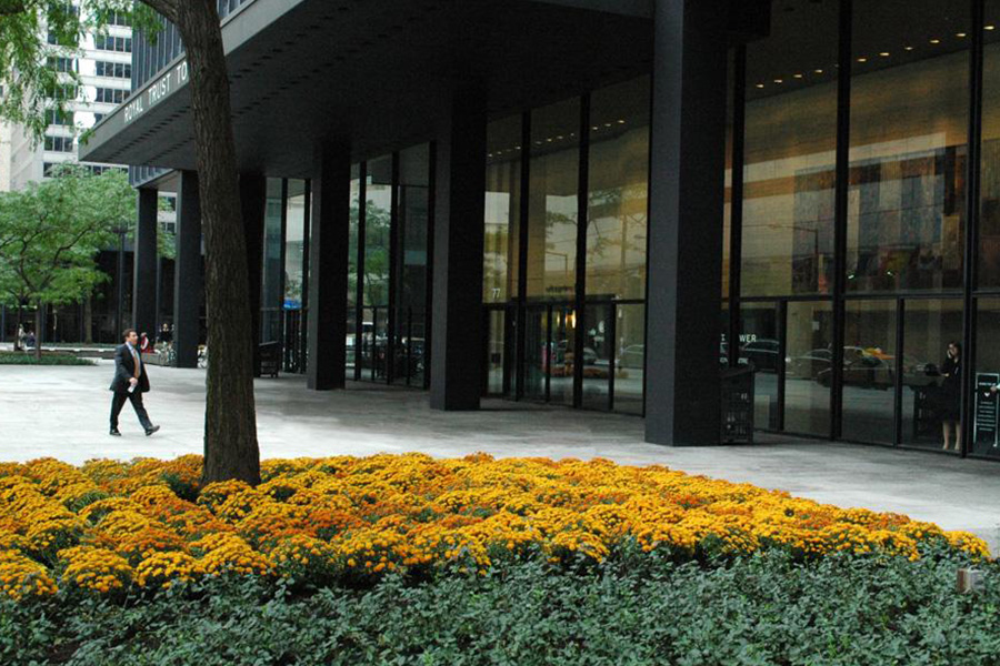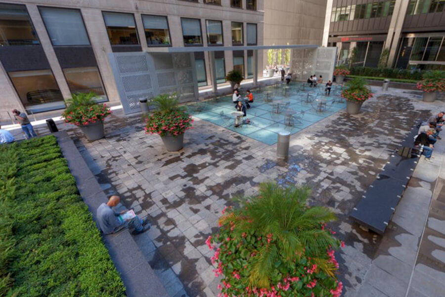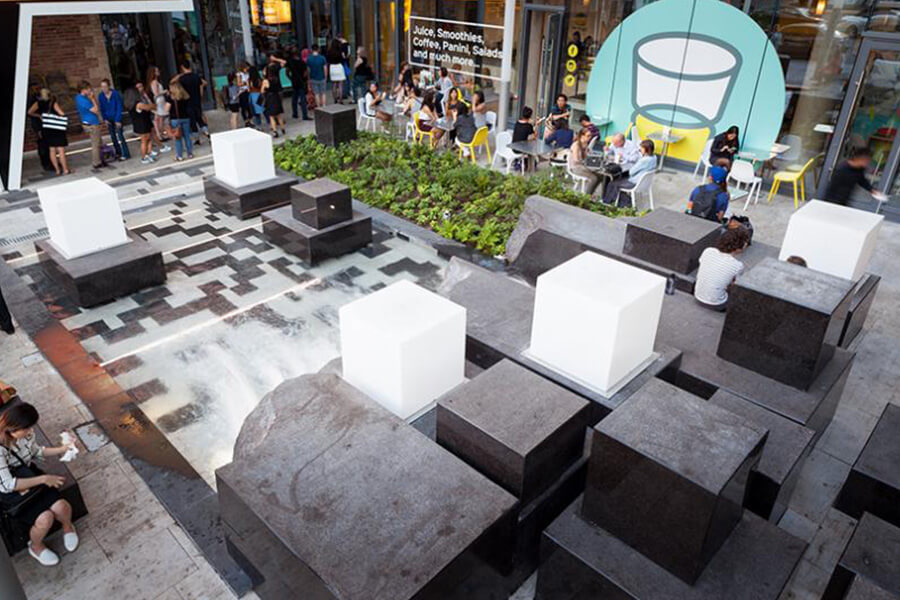 The courtyard at 30 Adelaide Street East is an active urban space that has become an important part of Toronto’s downtown experience. Dominated by two majestic Ginkgo trees, our courtyard design incorporates a bold sweeping granite arc flanked by elegant stainless steel walls. Canada Limestone cubes are scattered along the edge of a simple water fountain – an invitation for local business people to relax and take a break.