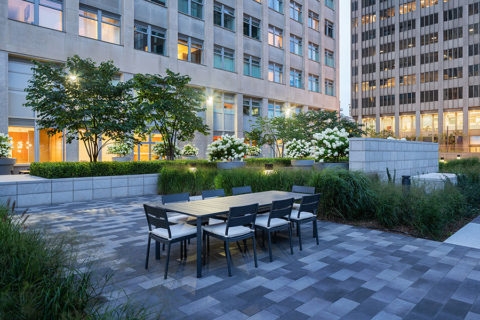 Maintaining the legacy of the century-old church’s limestone walls, our landscape design of the courtyard features an elegant and refined planting palette, clean granite paving, honey locust trees, and benches. Boxwoods, aromatic sumac, and masses of hardy, low maintenance native grasses surround granite pillars and contemporary sculptures by artists Angela Bulloch, Erin Shirreff, Iris Häussler, Joi T. Arcand, and Julia Dault. The public courtyard is connected to the streetscape by a corridor of eight honey locust trees. An ambient lightning strategy and textured paving pattern weave throughout, connecting the site to the larger Imperial Village aesthetic.