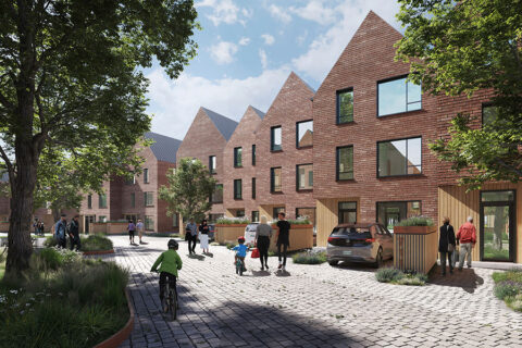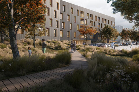 Sustainability is core to the project, which targets an 80 per cent reduction in embodied carbon against industry standard. Additionally, the design uses Passive House principles to enable low energy use throughout the life of the buildings and enabling passive ventilation and daylight to create a healthy living environment. In the landscape, hardscapes have been designed to utilize lower carbon, permeable alternatives wherever possible.